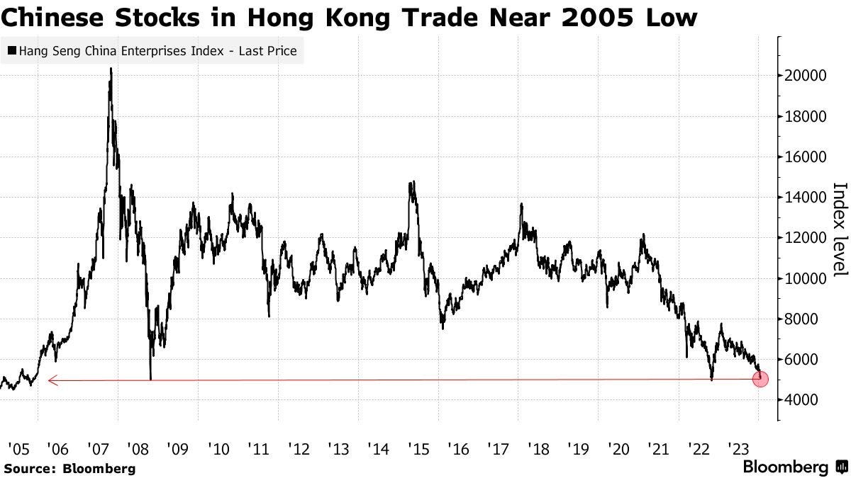 Chỉ số Hang Seng China Enterprises Index giảm 2.4%, tiến gần hơn đến mức được nhìn thấy lần cuối gần hai thập kỷ trước