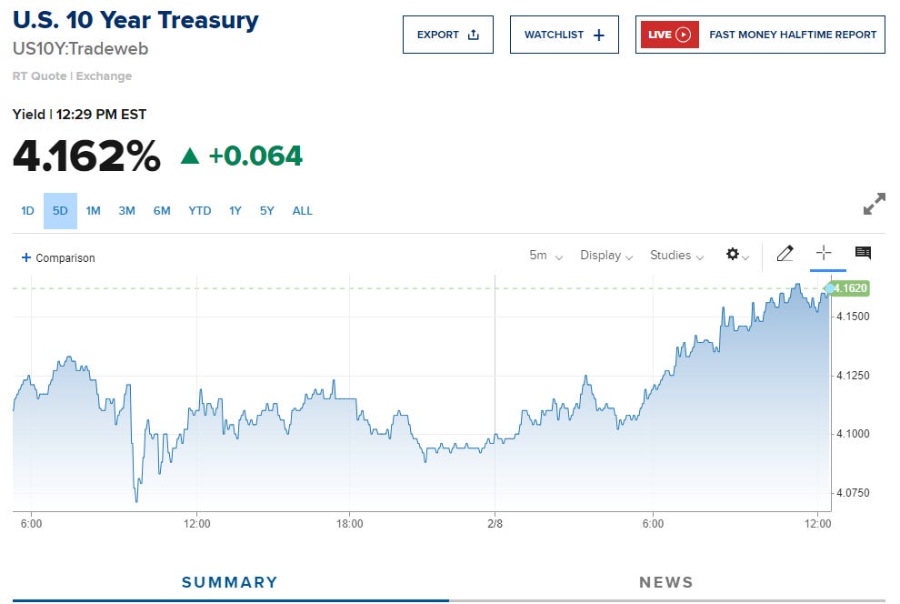 Lợi suất trái phiếu kho bạc 10Y tăng lên 4.16% sau báo cáo lao động mạnh mẽ.