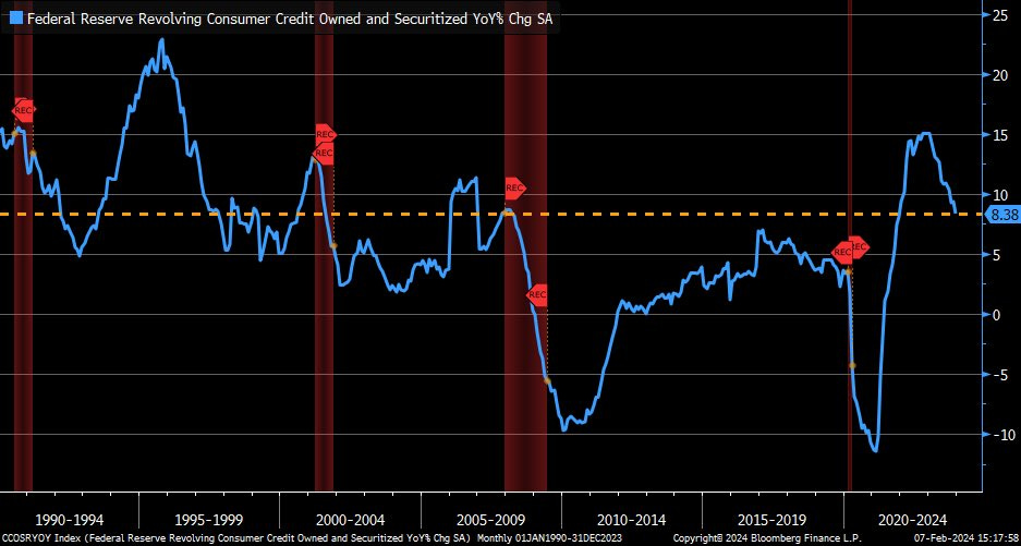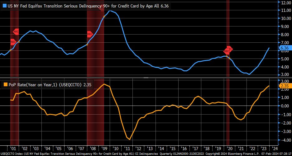 Tuy nhiên, tỷ lệ quá hạn thẻ tín dụng (màu xanh) tiếp tục tăng lên 6.36%, với tốc độ tăng nhanh nhất kể từ cuộc Khủng hoảng tài chính 2007–08.