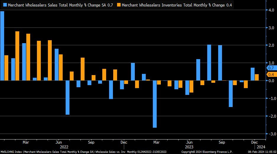 Doanh số bán buôn tháng 12 tăng +0.7% MoM, cao hơn ước tính 0.3%. Tồn kho tăng +0.4% MoM.