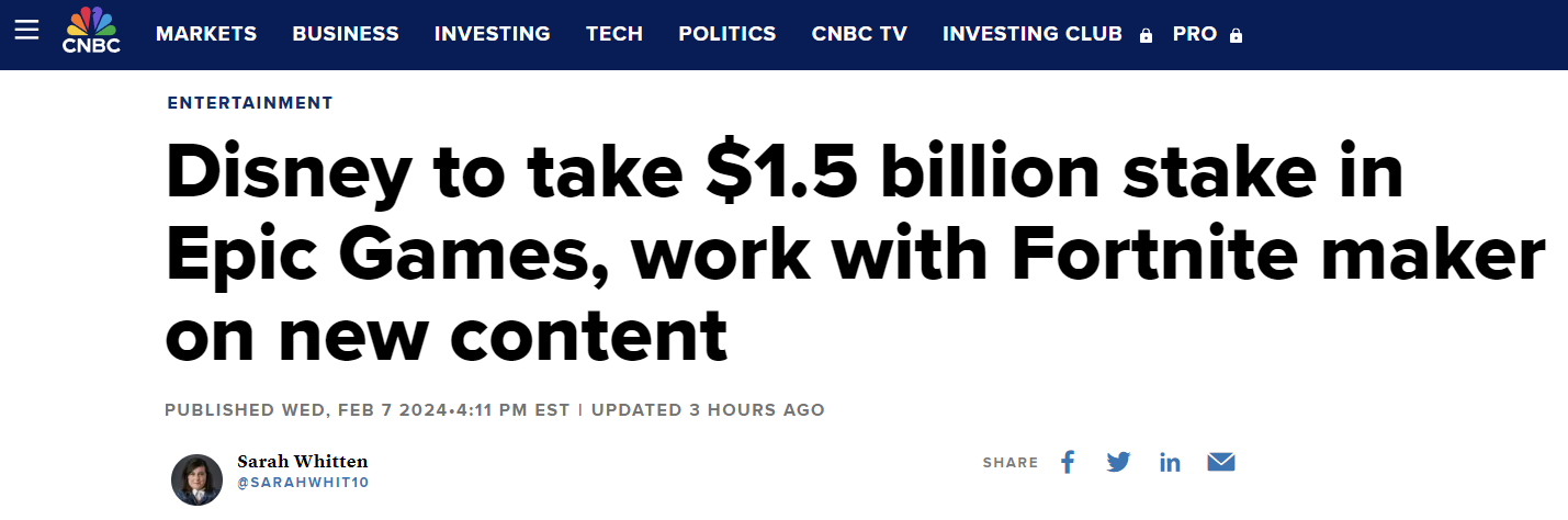 Disney đang đầu tư 1.5 tỷ USD vào Epic để tạo ra một "hệ sinh thái" game có khả năng “mở rộng và liên kết với Fortnite”.