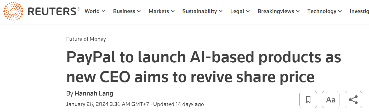 Trước đó (01/26), PayPal ra mắt các hỗ trợ AI để vực dậy giá cổ phiếu.