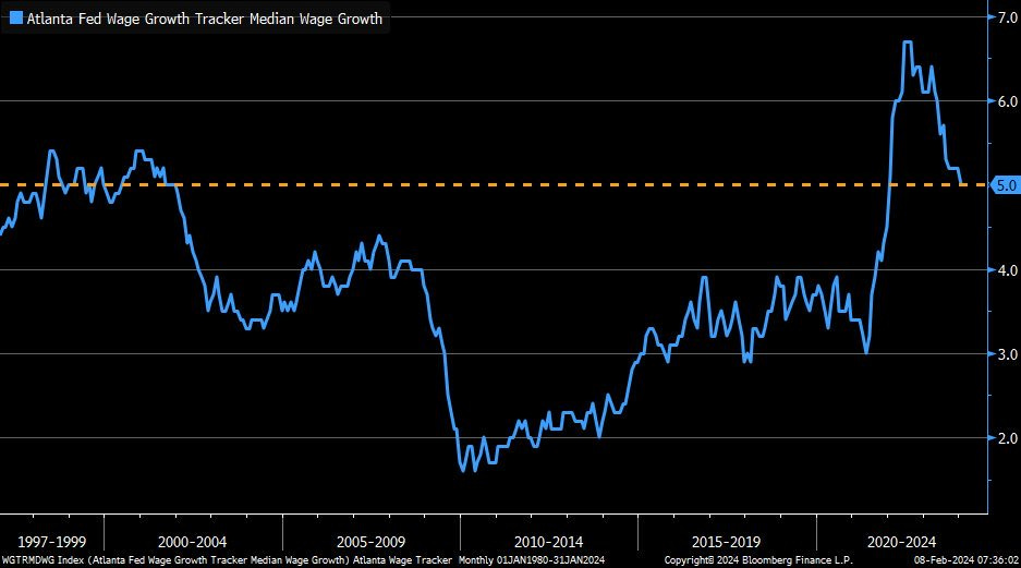 Chỉ báo tăng trưởng lương từ AtlantaFed giảm xuống +5% trong tháng 1 (từ mức cao nhất +6.7%).