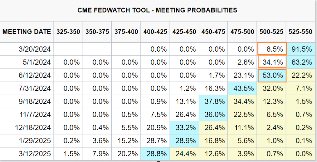 Sau báo cáo CPI, thị trường tiếp tục đẩy lùi kỳ vọng về lần đầu Fed cắt lãi suất từ tháng 5 xuống tháng 6 (trong khi 1 tháng trước, thị trường vẫn hi vọng Fed cắt giảm từ tháng 3)