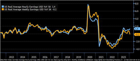 Thu nhập trung bình thực tế theo giờ tăng nhẹ, nhưng thu nhập trung bình theo tuần đã giảm (có thể do số giờ làm việc trung bình theo tuần giảm).