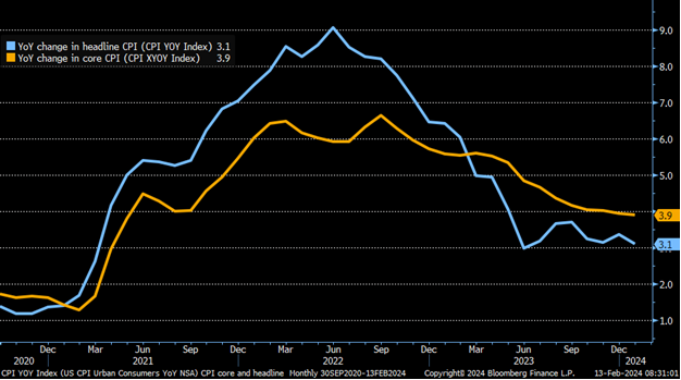 CPI tổng hợp Y/Y (dù vẫn trên đà giảm) đã gây thất vọng do cao hơn mức dự đoán. Trong khi CPI cốt lõi thể hiễn rõ việc lạm phát còn cứng đầu (sticky inflation):
