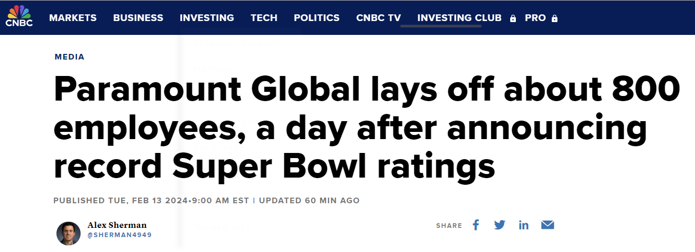 Paramount Global sa thải khoảng 800 nhân viên chỉ một ngày sau khi thông báo lượng người xem Super Bowl đạt kỷ lục.