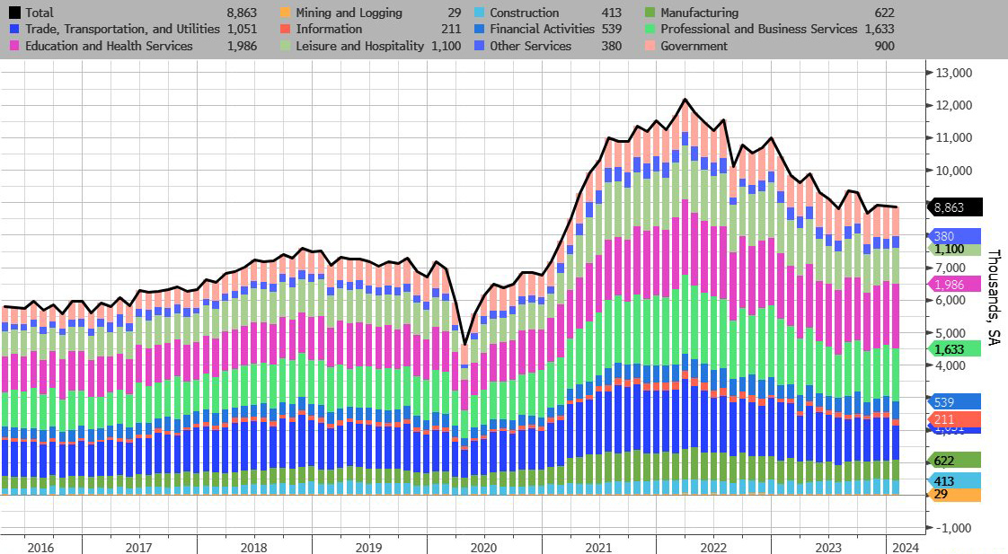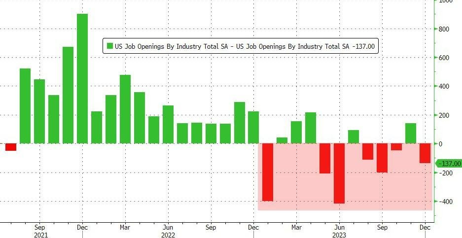 Thống kê cơ hội việc làm của JOLTS đã được điều chỉnh giảm với con số lớn trong 6/8 tháng gần nhất.