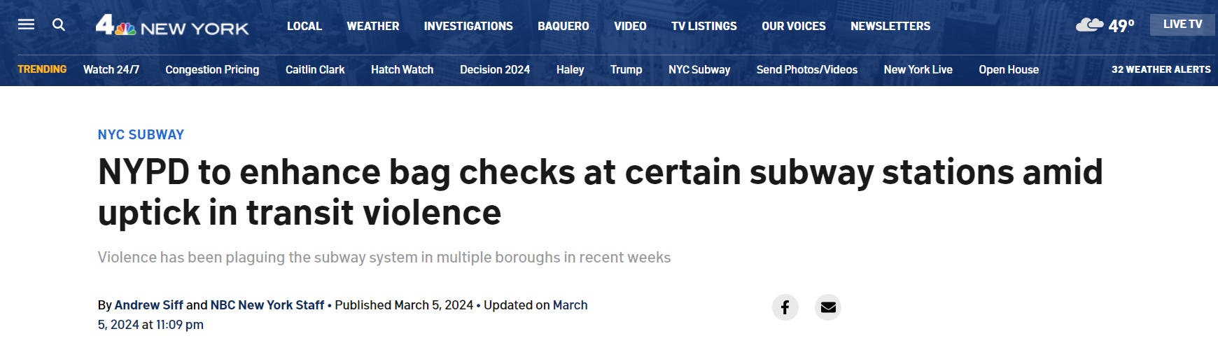 New York cử 750 sĩ quan Vệ binh Quốc gia + 250 sĩ quan lực lượng cảnh sát tiểu bang và MTA đến hệ thống tàu điện ngầm do số lượng các vụ bạo lực gia tăng.