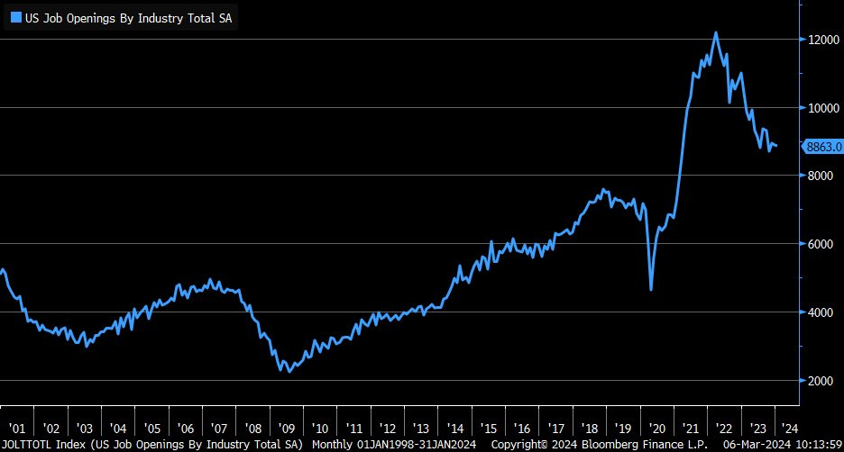 Số việc làm đăng tuyển/ cơ hội việc làm tháng 1 (JOLTS) giảm còn 8.863 triệu trong (từ 8.889 triệu trong tháng 12).