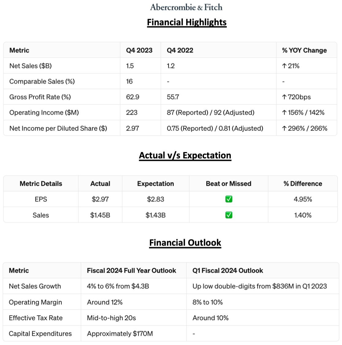 Doanh thu Q4: +21% Y/Y lên 1.5 tỷ USD - trong đó: Abercrombie +27% Y/Y , Hollister +6% Y/Y