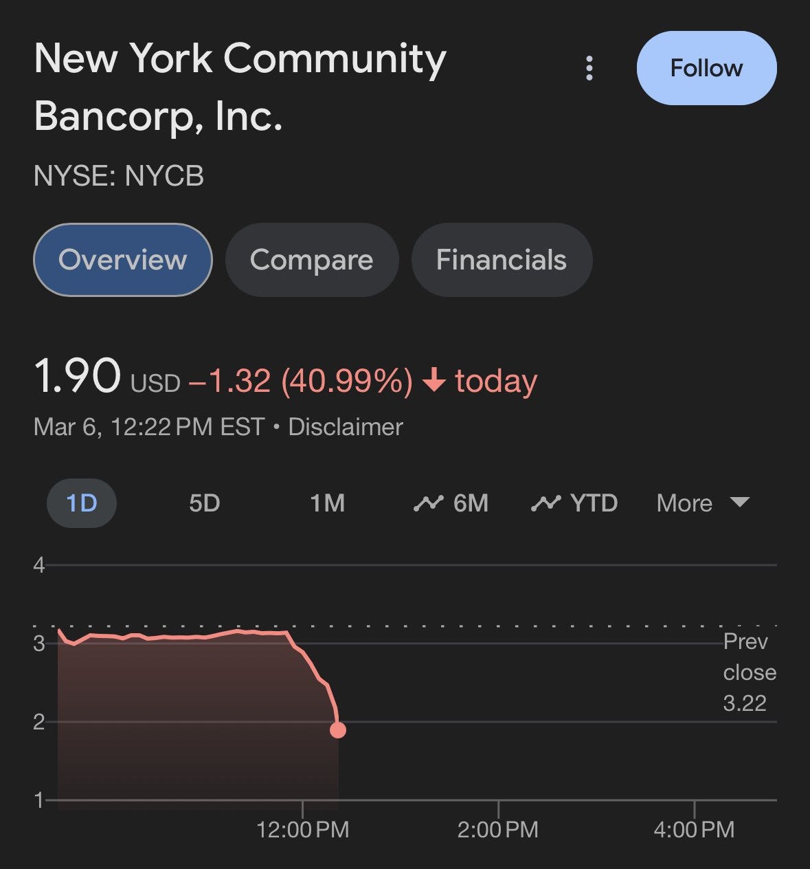 Có tin New York Community Bank đang tìm cách huy động vốn - cổ phiếu giảm > 40% sáng nay, kéo theo cổ phiếu ngân hàng khu vực giảm.