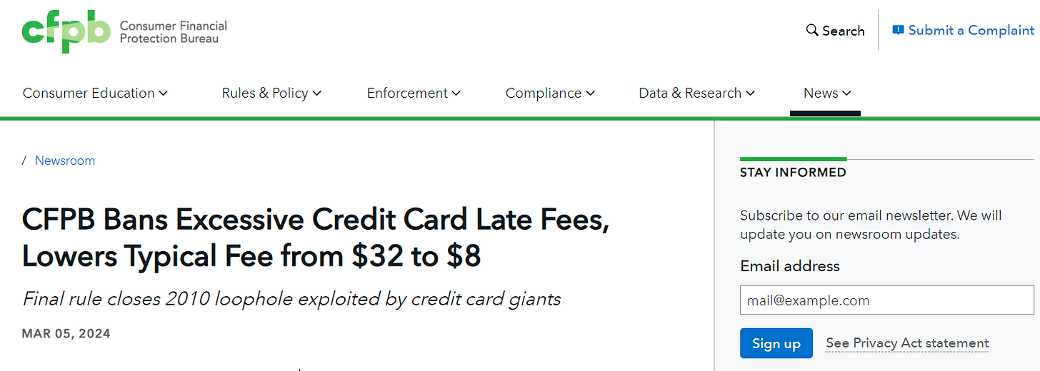 Cơ Quan Bảo Vệ Tài Chính Tiêu Dùng (CFPB) đã ra quy định chỉ cho phép phạt tối đa $8 (từ mức trung bình $32) đối với nợ thẻ tín dụng bị trả trễ hạn.