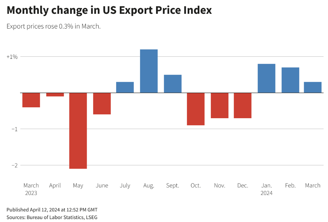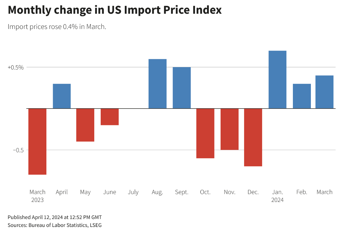 Giá nhập khẩu tháng 3 đạt +0.4% MoM (> dự báo & tháng trước 0.3%), tăng 3 tháng liên tiếp do năng giá năng lượng và thực phẩm.