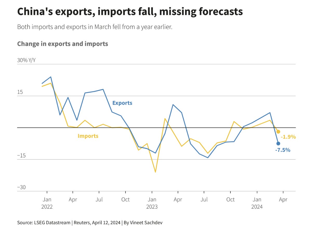 Xuất nhập khẩu tháng 3 của Trung Quốc giảm mạnh. Xuất khẩu (-7.9% YoY), nhập khẩu (-1.9% YoY) dù nhà sản xuất đang giảm giá để duy trì doanh số bán hàng cho thấy nhu cầu nội địa vẫn còn yếu.