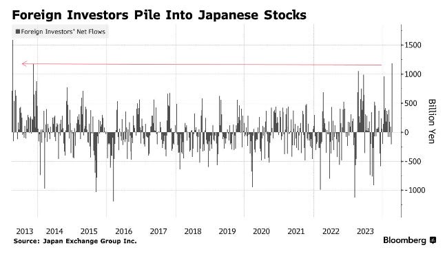 Nhà đầu tư nước ngoài mua ròng 7.7 tỷ USD cổ phiếu Nhật Bản tuần trước, cao nhất kể từ năm 2013.