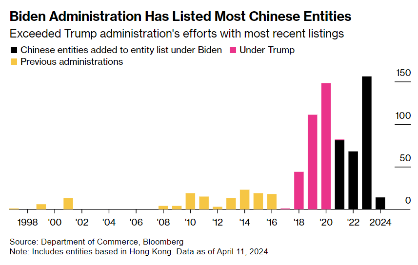 Bộ Thương mại Mỹ cũng đã thêm 6 công ty Trung Quốc vào danh sách đen, nâng tổng số lên 319 (so với con số 306 dưới thời Donald Trump), nhằm hạn chế khả năng tiếp cận của Trung Quốc tới chip và công nghệ tiên tiến do lo ngại an ninh quốc gia.