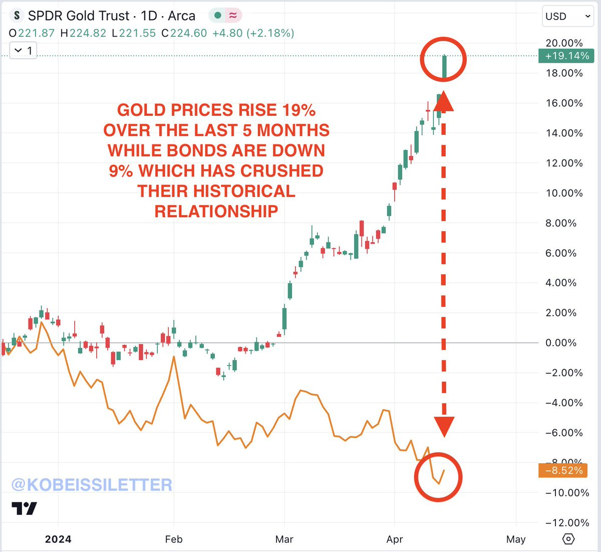 Lần đầu tiên trong vài thập kỷ, vàng và trái phiếu đang được giao dịch hoàn toàn đối lập, chủ yếu do lo ngại lạm phát trở lại.