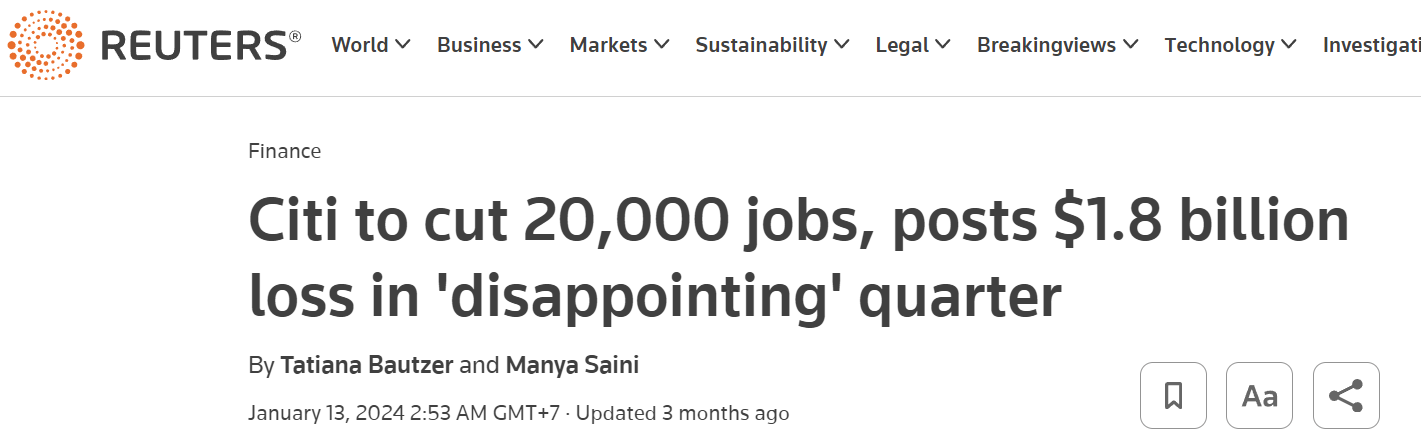 Trước đó, Citi có kế hoạch cắt giảm 20,000 nhân sự, đã có 7,000 nhân sự bị cắt giảm trong quý đầu tiên.