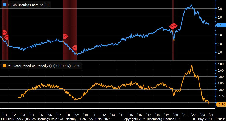 Đáng chú ý là tỷ lệ biến động việc làm JOLTS theo chu kỳ 2 năm đã giảm xuống -2.3bps dù không trong giai đoạn suy thoái.