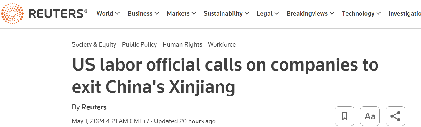 Mỹ kêu gọi các công ty rời khỏi Tân Cương, Trung Quốc do lo ngại lao động bị cưỡng bức. Chính phủ Trung Quốc kịch liệt phủ nhận các cáo buộc.