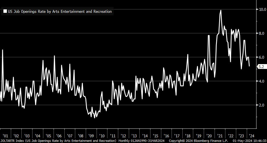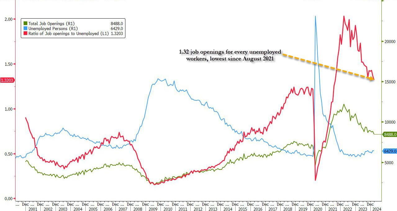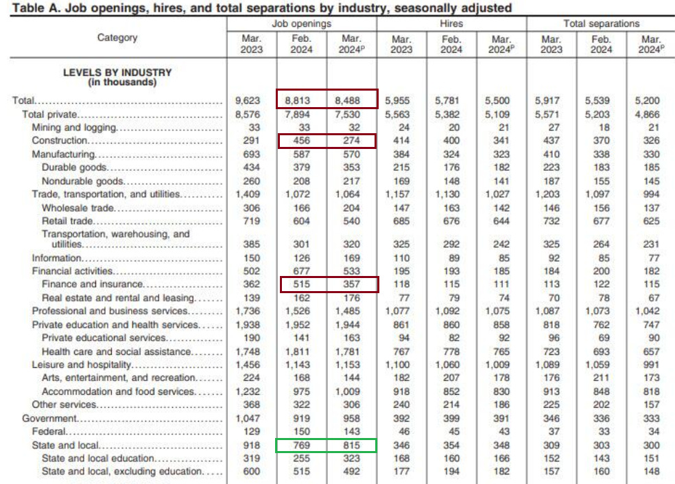 Số lượng việc đăng tuyển tháng 3 giảm thấp nhất kể từ sau Covid xuống 8.488 triệu (< ước tính 8.69 triệu, tháng trước 8.813) - Báo cáo JOLTs.