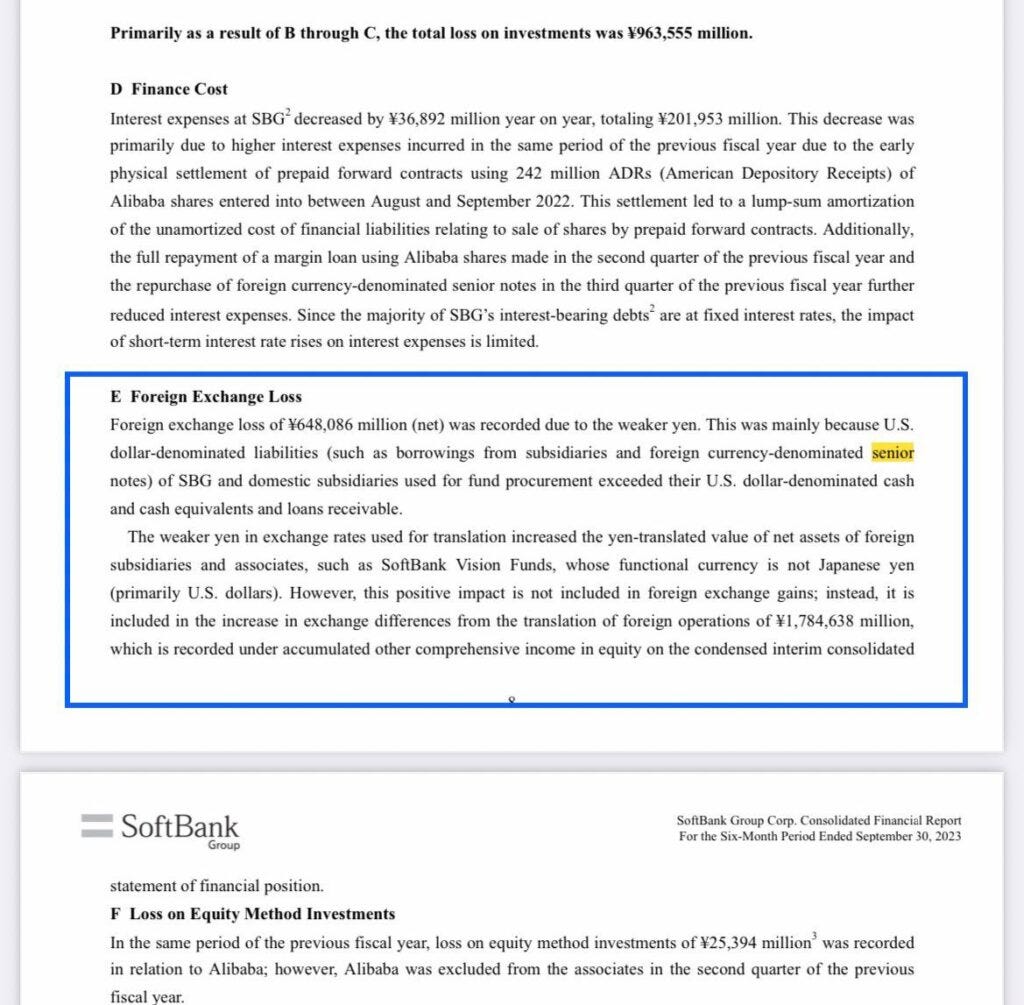 Q3/2023, JPY mất giá khoảng 3.5% so với USD và Softbank lỗ 648 tỷ JPY do tỷ giá USDJPY không có lợi cho các khoản nợ tài trợ bằng đồng USD của họ: