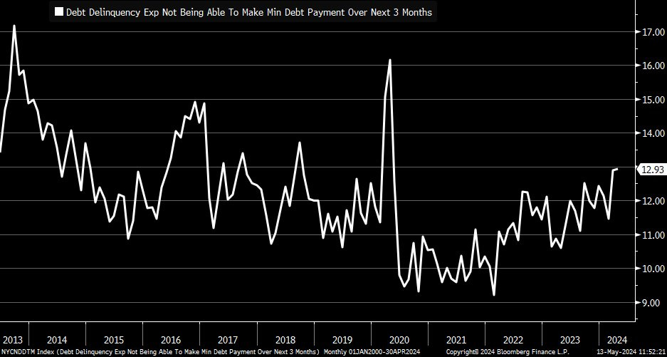 Tỷ lệ người tiêu dùng cho rằng họ sẽ không thể trả được khoản nợ tối thiểu trong 3 tháng tới đang ở mức cao nhất kể từ đại dịch