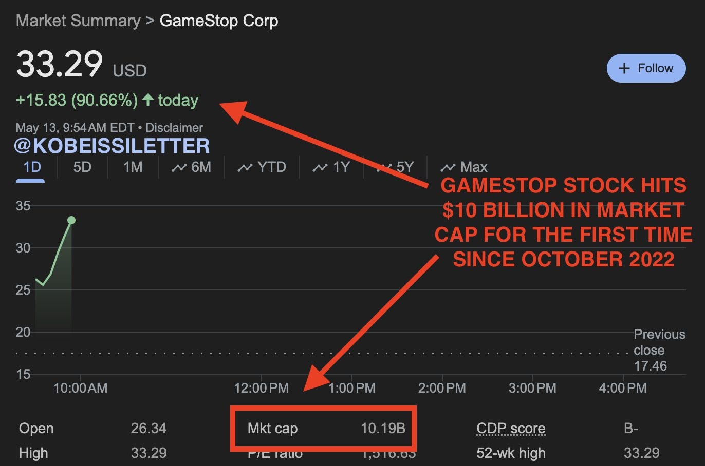 Gamestop chạm mốc vốn hóa 10 tỷ USD lần đầu tiên kể từ tháng 10/2022, tăng +91% trong phiên hôm nay