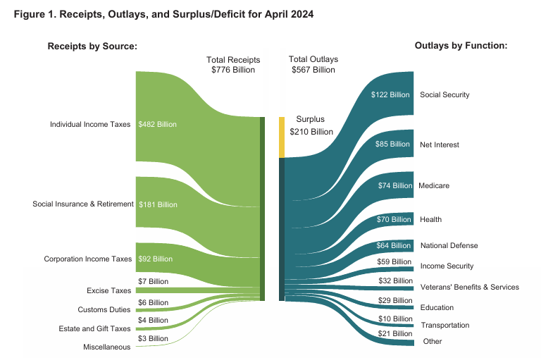 Kho bạc Hoa Kỳ đã báo cáo thặng dư 210 tỷ USD trong tháng 4 với 776 tỷ USD thu được và 567 tỷ USD chi ra