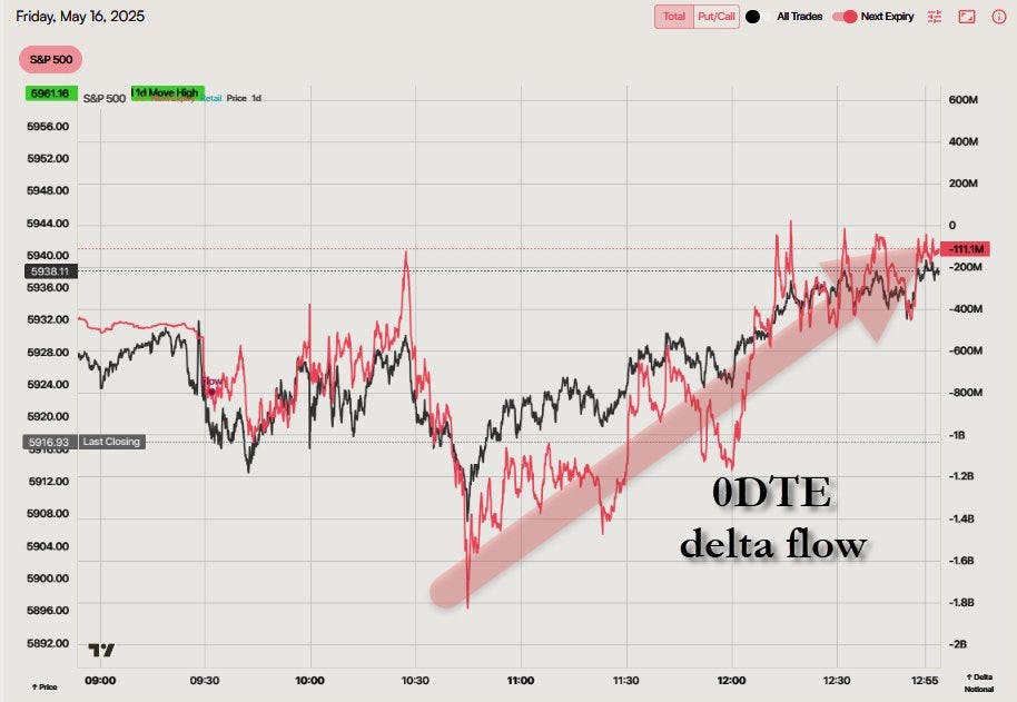 Qua một chút về OpEx, gần như toàn bộ OpEx hiện tại nằm ở 2 level 5900 và 6000 với 5900 hold khi thị trường pullback sáng nay. Dòng 0DTE đẩy vào đưa thị trường đi lên với SPX vào trạng thái “gamma sensitive” - những call ở gần 6000 đầu ngày tưởng đã hết cơ hội quay lại, kéo theo dòng positive delta hedge đẩy market.