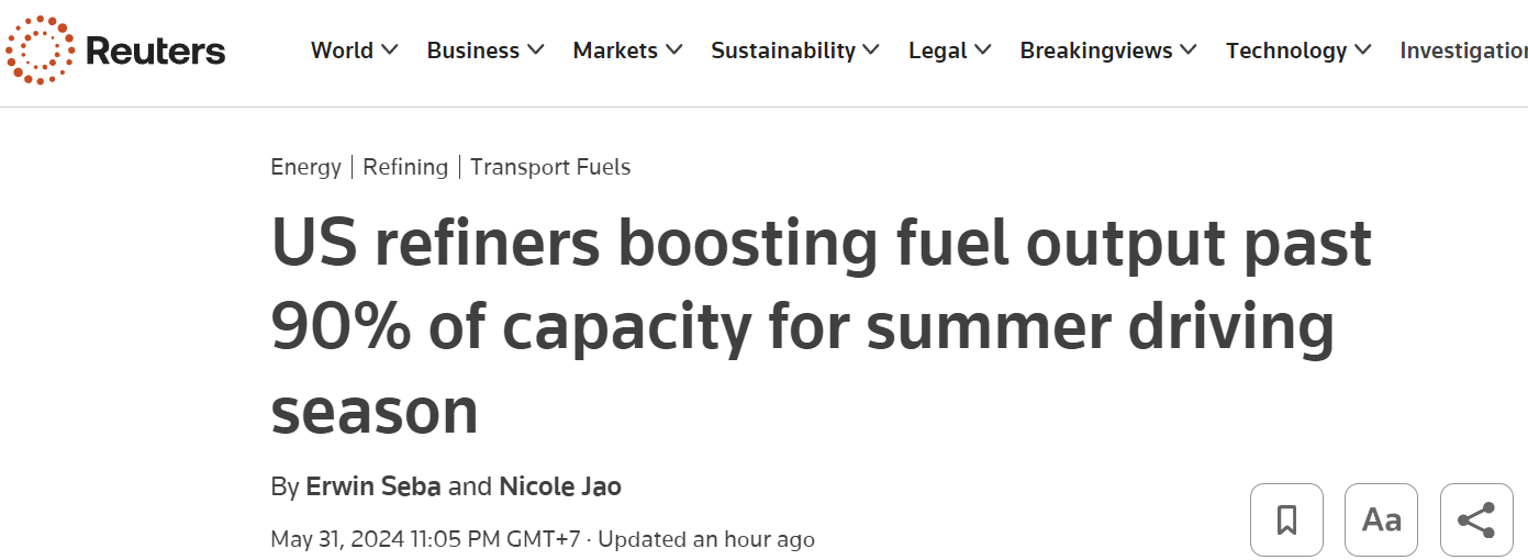 Các nhà máy lọc dầu của Mỹ tăng sản lượng vượt 90% công suất chuẩn bị cho mùa hè du lịch của các hộ gia đình.