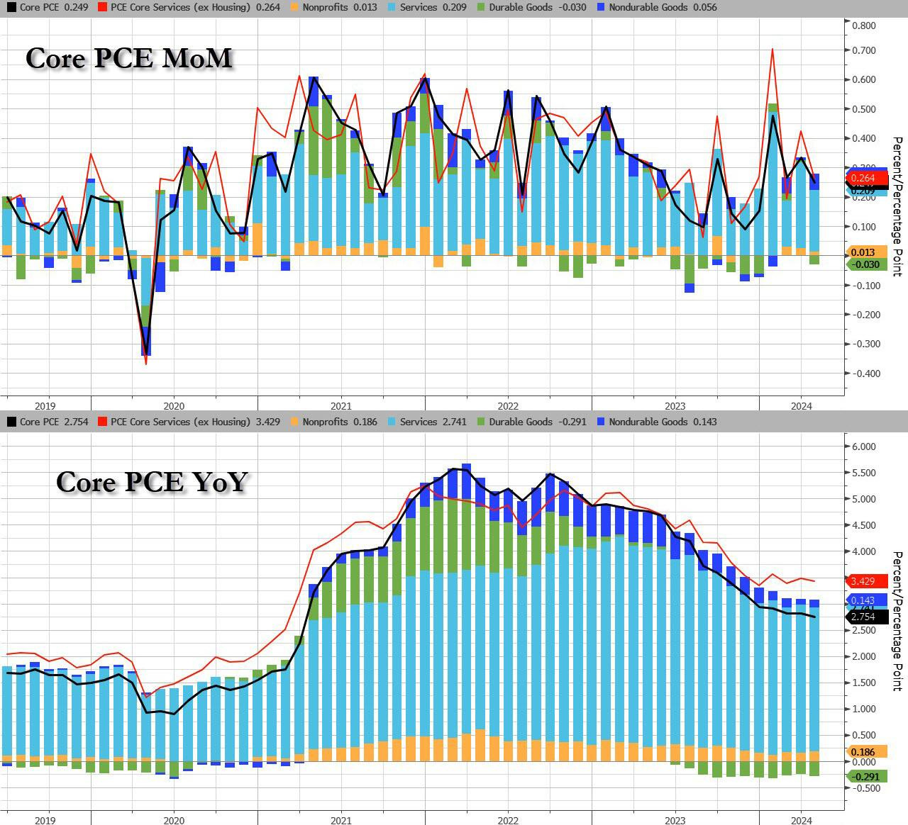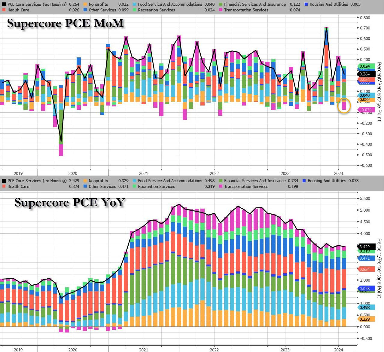 Tăng trưởng PCE siêu cốt lõi (dịch vụ cốt lõi trừ nhà ở) giảm so với tháng trước: nhưng vẫn ở mức cao.