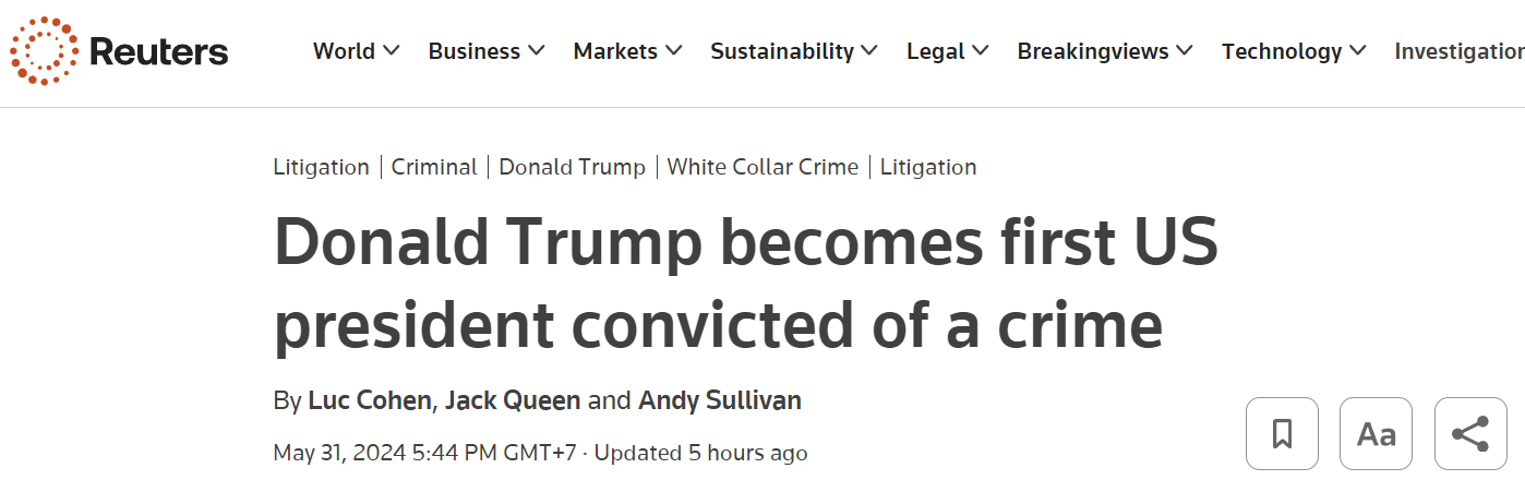 Donald Trump trở thành cựu Tổng thống Mỹ đầu tiên bị kết tội hình sự với 34 tội danh làm giả hồ sơ kinh doanh để chi tiền “bịt miệng” ngôi sao phim khiêu dâm trước thềm cuộc bầu cử 2016.