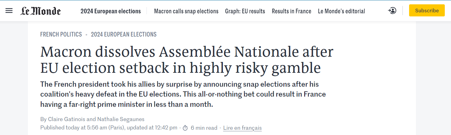 Tổng thống E.Macron ngay lập tức tuyên bố giải tán Quốc hội và kêu gọi nước Pháp sớm tổ chức bầu cử lập pháp.