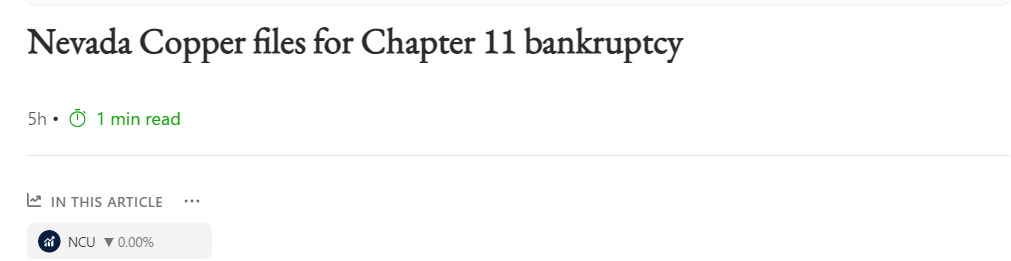 Công ty khai thác khoáng sản Nevada Copper nộp đơn xin phá sản sau khi không huy động được thêm vốn