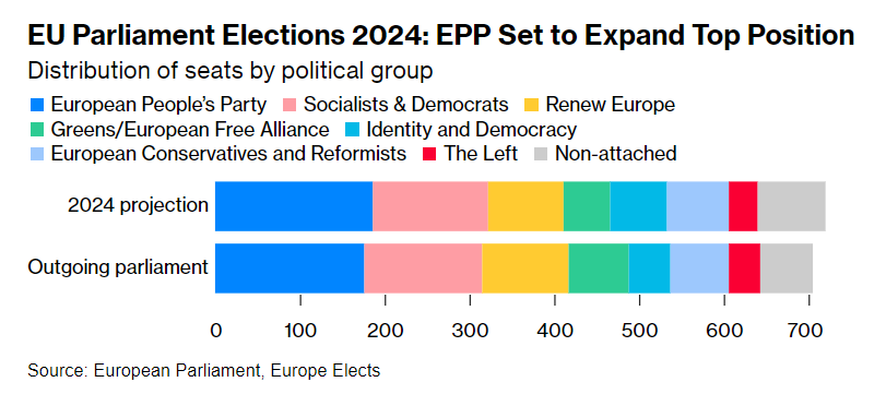 Đảng Nhân dân châu Âu (EPP) trung hữu sẽ là nhóm chính trị lớn nhất trong cơ quan lập pháp mới, giành được 5 ghế cho 189 đại biểu.