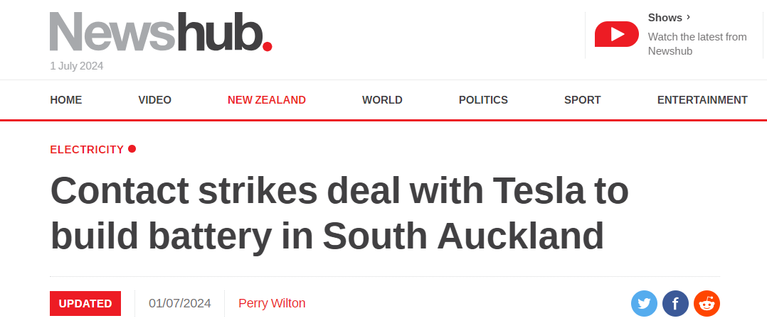 Tesla hợp tác với Contact Energy - công ty điện lực New Zealand xây dựng hệ thống lưu trữ pin khổng lồ 100 MW - trị giá 163 triệu USD New Zealand