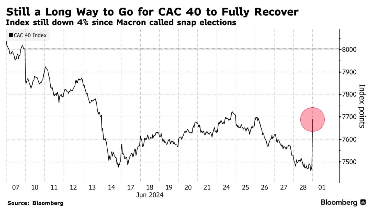 Tuy vậy, CAC40 vẫn chưa hồi phục được mức trước khi Macron kêu gọi bầu cử bất ngờ.