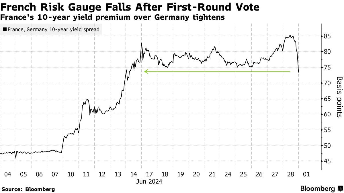 Lợi tức TPCP Pháp 10Y giảm đầu giờ sáng (giờ Châu Âu) —giảm so với lợi tức trái phiếu cùng kỳ của Đức (yield premium giảm liền ~-7bps).