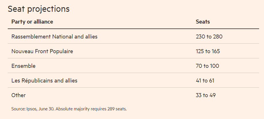 Dự đoán cho thấy RN và đồng minh đang giành được nhiều ghế nhất trong Quốc hội và khả năng áp đảo trong vòng bỏ phiếu cuối cùng vào ngày 07/07