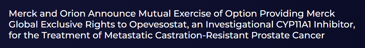 Merck và Orion chuyển đổi thỏa thuận hợp tác phát triển opevesostat - chất ức chế bệnh ung thư tuyến tiền liệt, thành giấy phép độc quyền cho Merck.