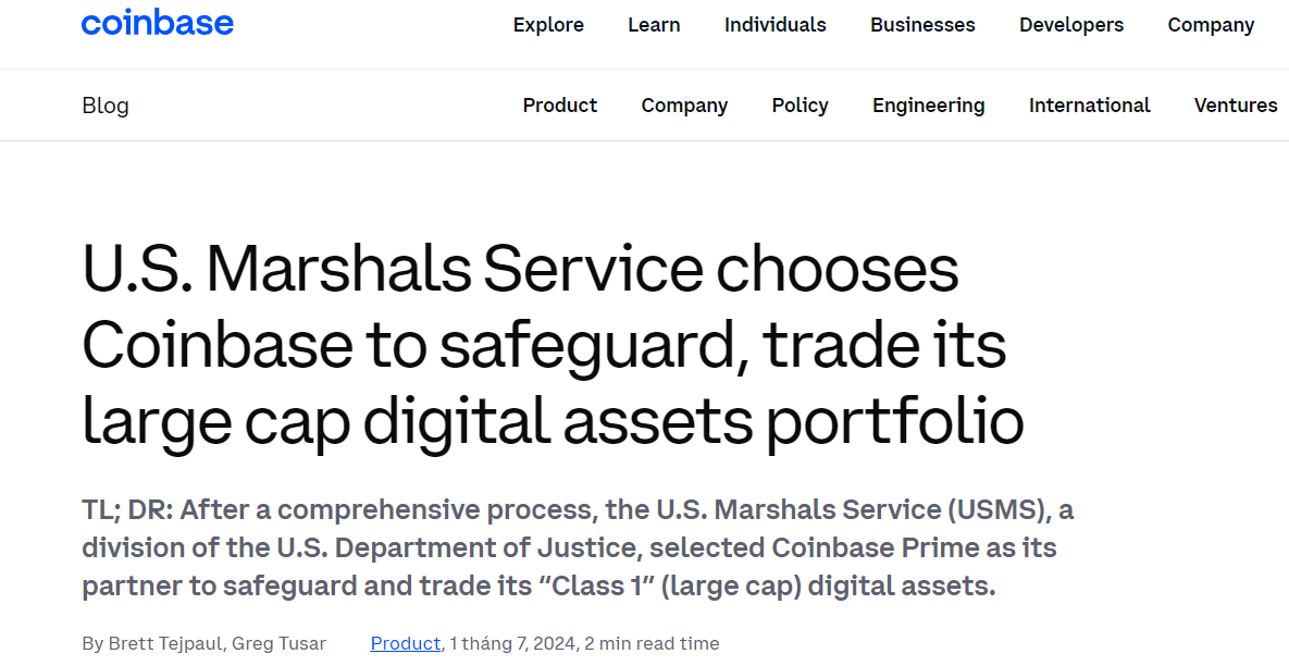 Cảnh sát Tư pháp Hoa Kỳ chọn Coinbase để giao dịch tài sản kỹ thuật số với số vốn lớn