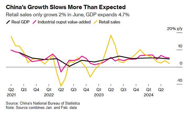 Tăng trưởng GDP Trung Quốc quý 2 chậm lại, chỉ đạt +4.7% YoY - mức thấp nhất kể từ quý 1/2023 do doanh số bán lẻ suy yếu.
