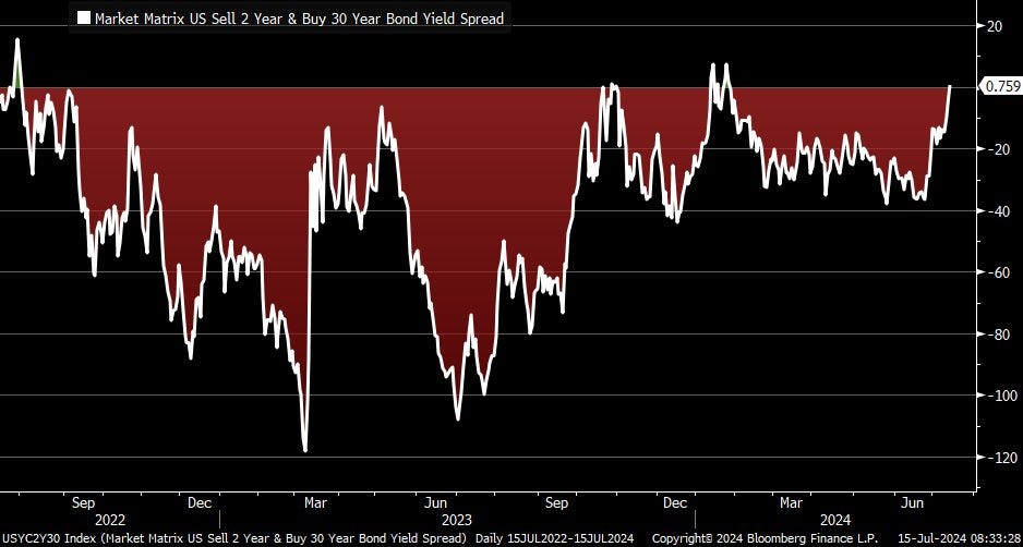 Lợi suất trái phiếu kho bạc 30Y vượt lợi suất trái phiếu kho bạc 2Y lần đầu tiên kể từ tháng 1.