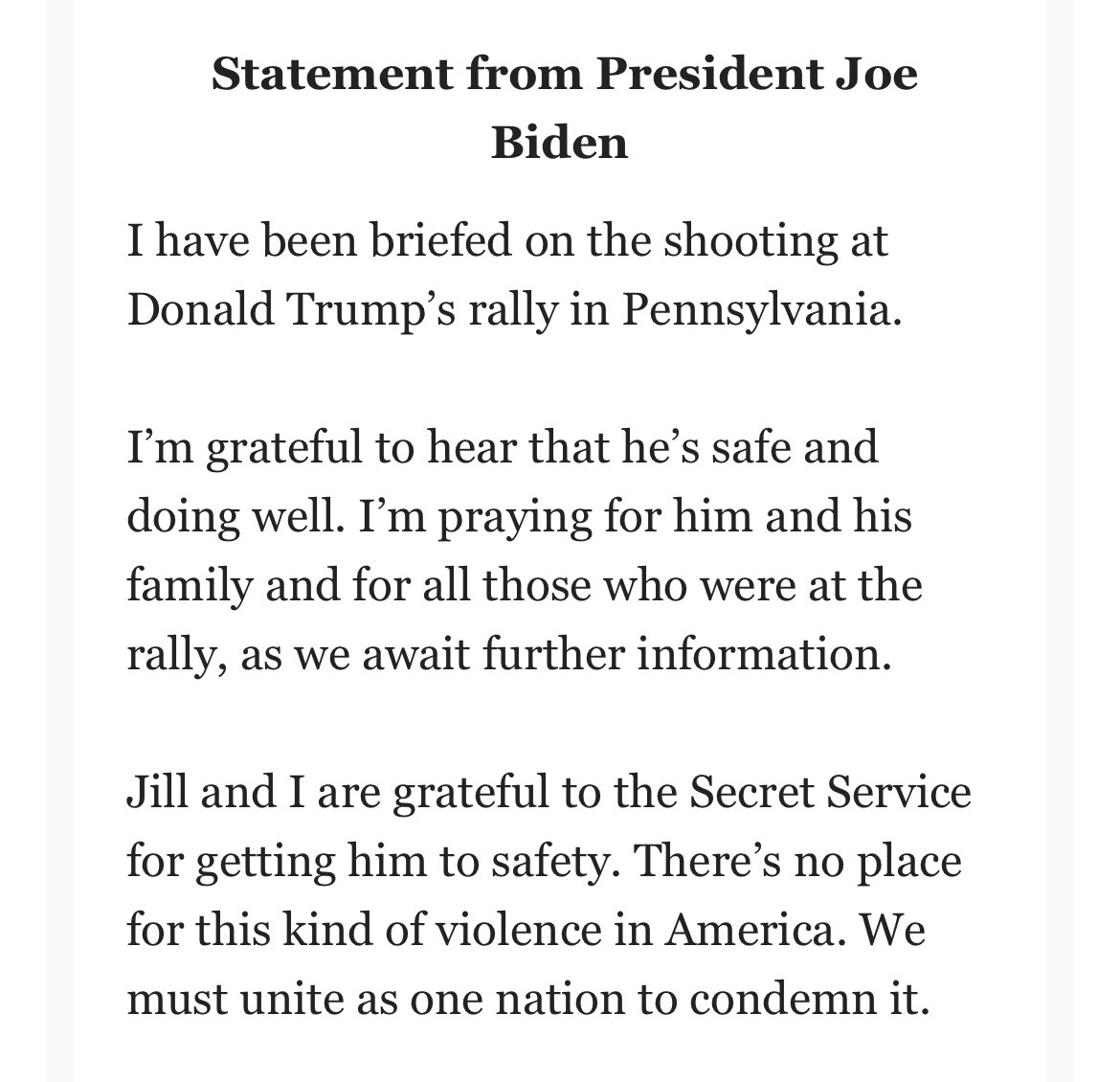 Tổng thống Biden chỉ trích vụ ám sát “không cho phép coi hành vi bạo lực là hiển nhiên”, “cần hạ nhiệt vấn đề chính trị căng thẳng”.
