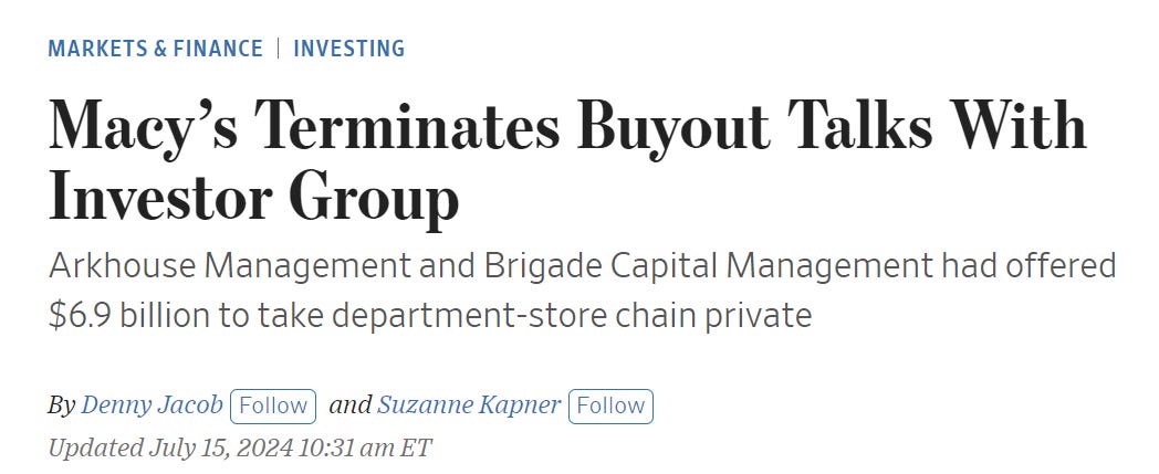 Macy's chấm dứt đàm phán với Arkhouse Management và Brigade Capital Management về đề nghị mua lại với giá 6.9 tỷ USD để chuyển Macy's thành công ty tư nhân.