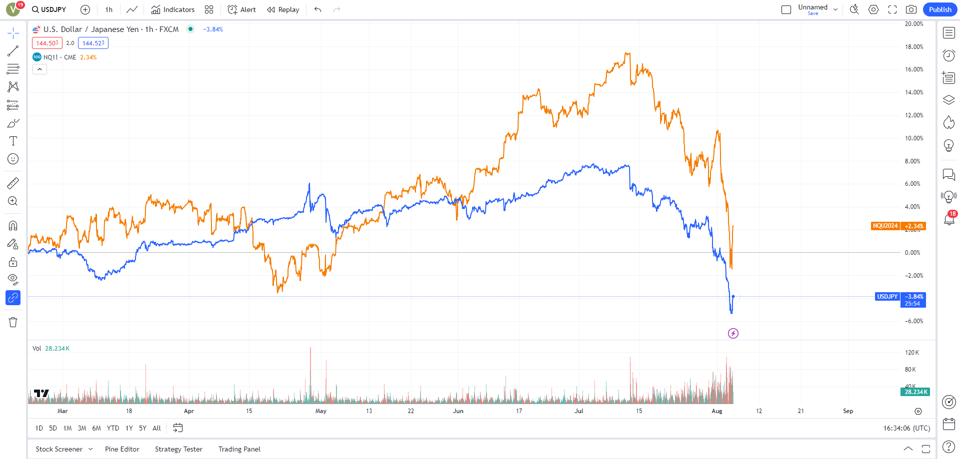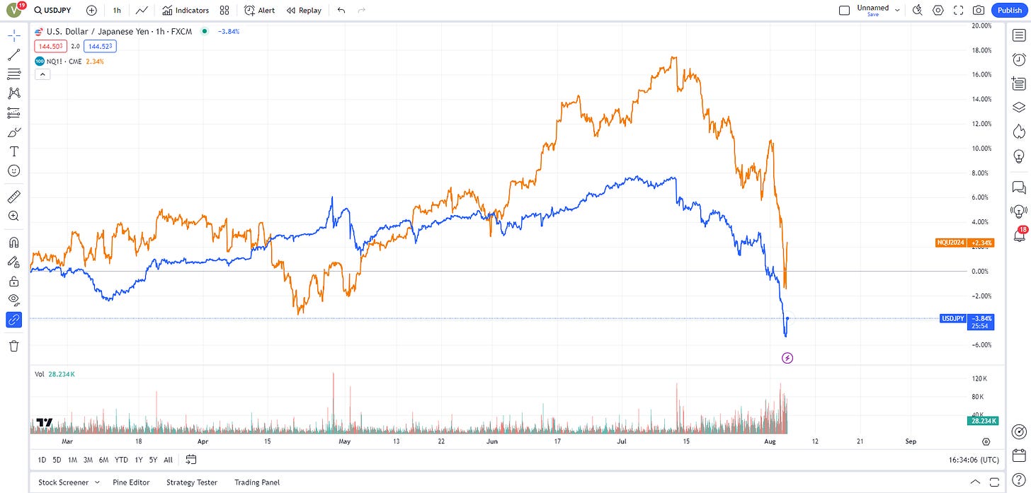 Ngày 07/31 vừa qua, đúng như Viet Hustler có đưa tin vào ngày 07/29, BoJ tăng lãi suất 0.25% và bắt đầu đẩy tỉ giá đồng Yen đi theo chiều ngược lại, buộc các nhà đầu tư Yen Carry Trade phải cover short bằng cách bán các sản phẩm đầu tư ở chiều ngược lại. Không chỉ có vậy, dữ liệu kinh tế xấu từ Mỹ làm tăng triển vọng cắt lãi suất của FED và đẩy giá trị USD đi xuống so với JPY.