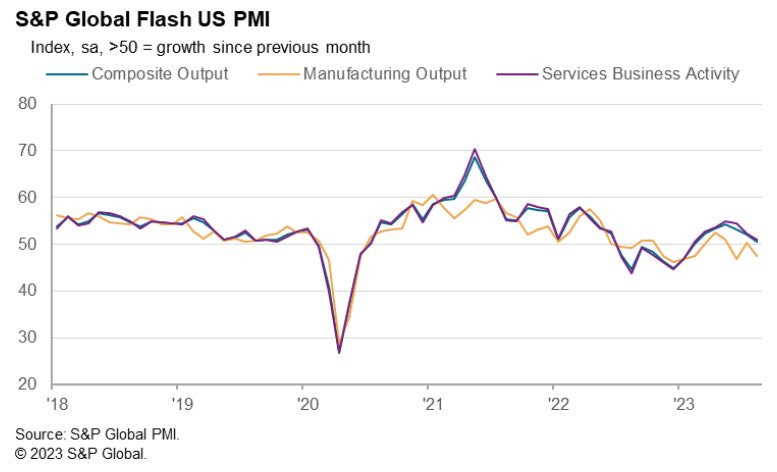 Chỉ số S&P Global dành cho nền công nghiệp Mỹ ra thấp hơn dự báo vào sáng nay với sản lượng công nghiệp giảm xuống 47 điểm từ 49 điểm tháng trước và dịch vụ giảm còn 51 điểm so với 52.3 trước đó.