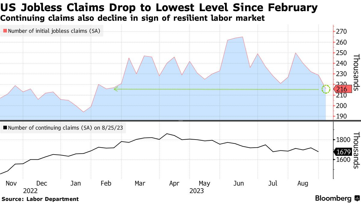 Theo dữ liệu của Bộ Lao động, số đơn xin trợ cấp thất nghiệp giảm 13,000 xuống còn 216,000 trong tuần kết thúc vào ngày 2 tháng 9. Con số này thấp hơn dự báo của tất cả các nhà kinh tế trong cuộc khảo sát của Bloomberg.